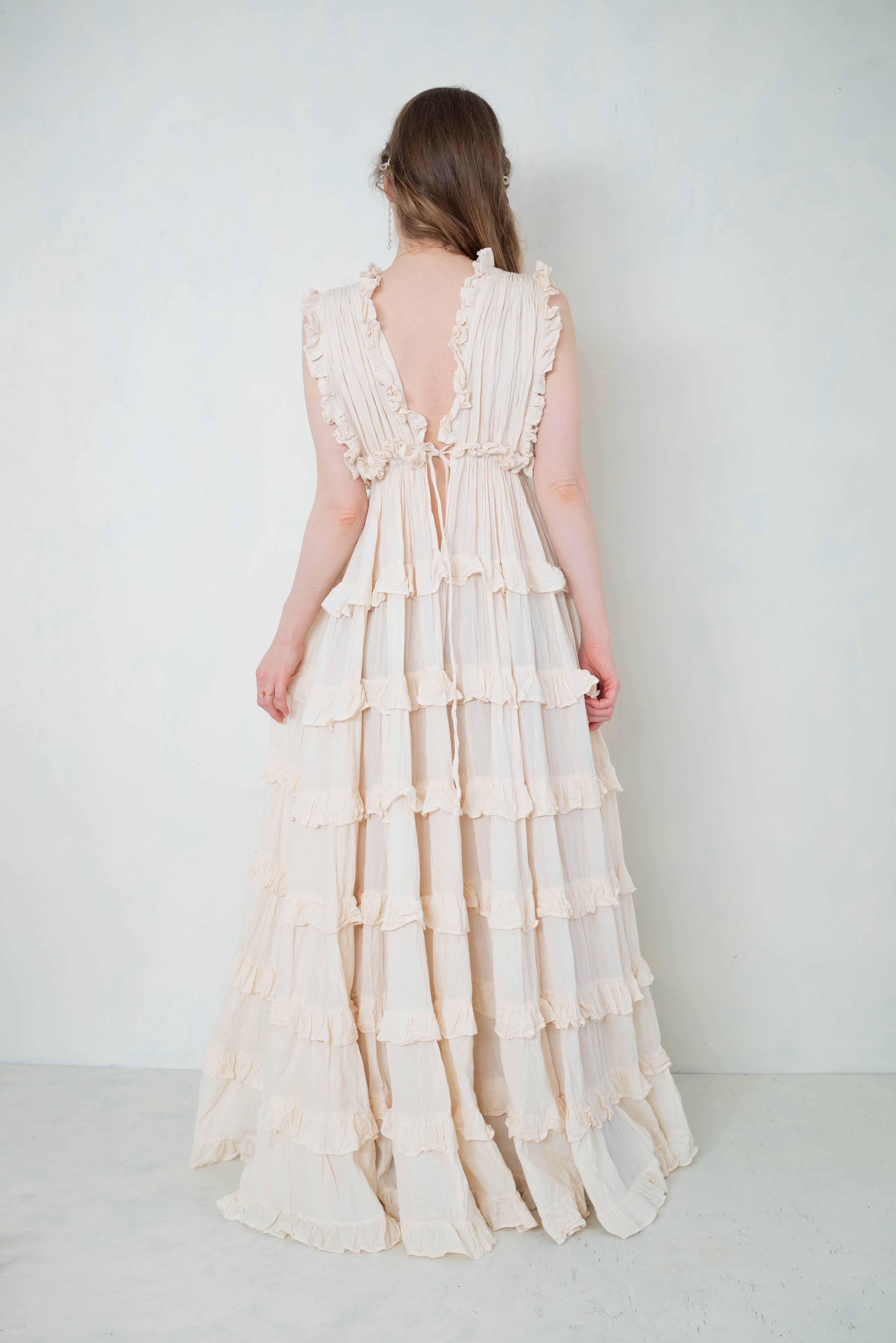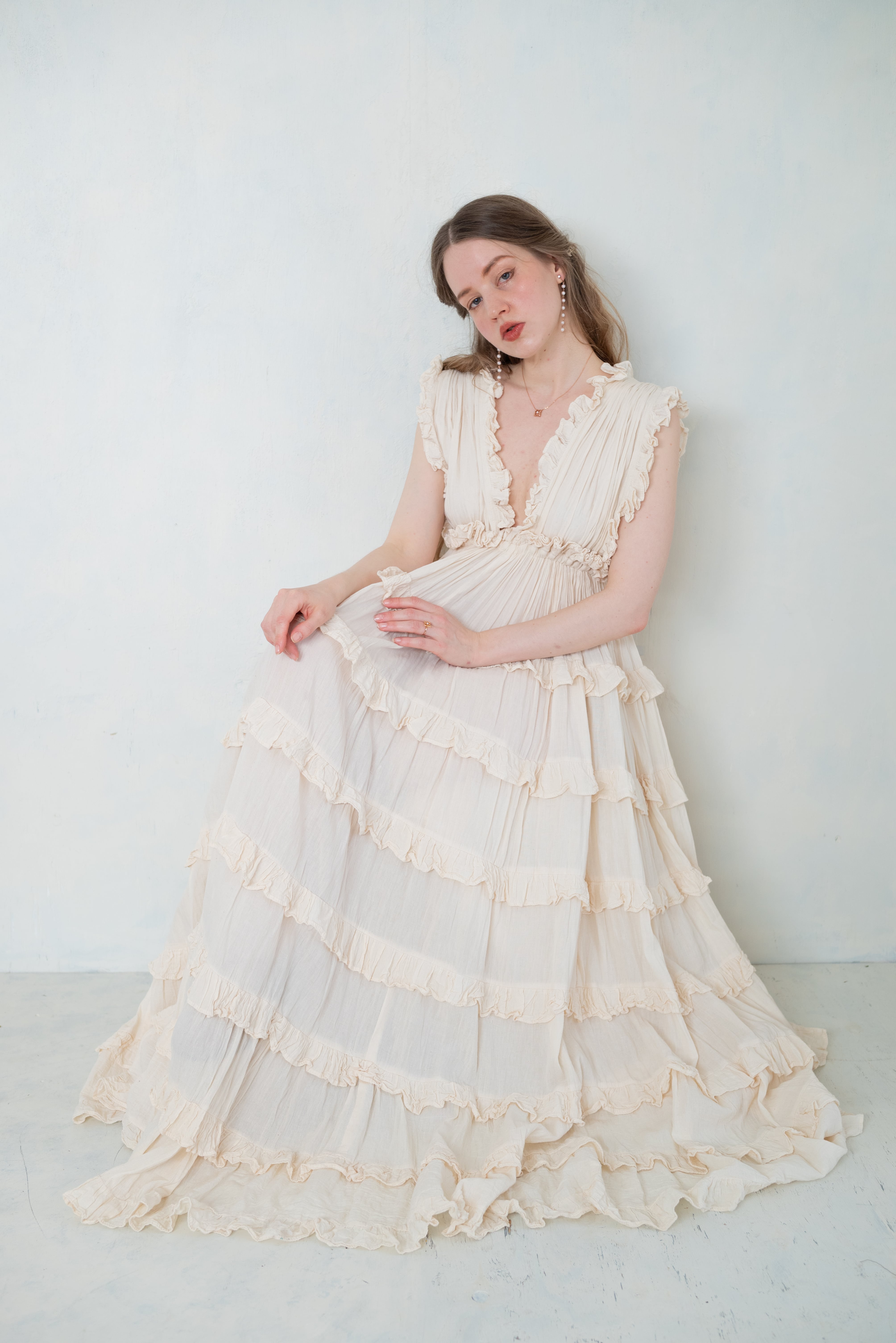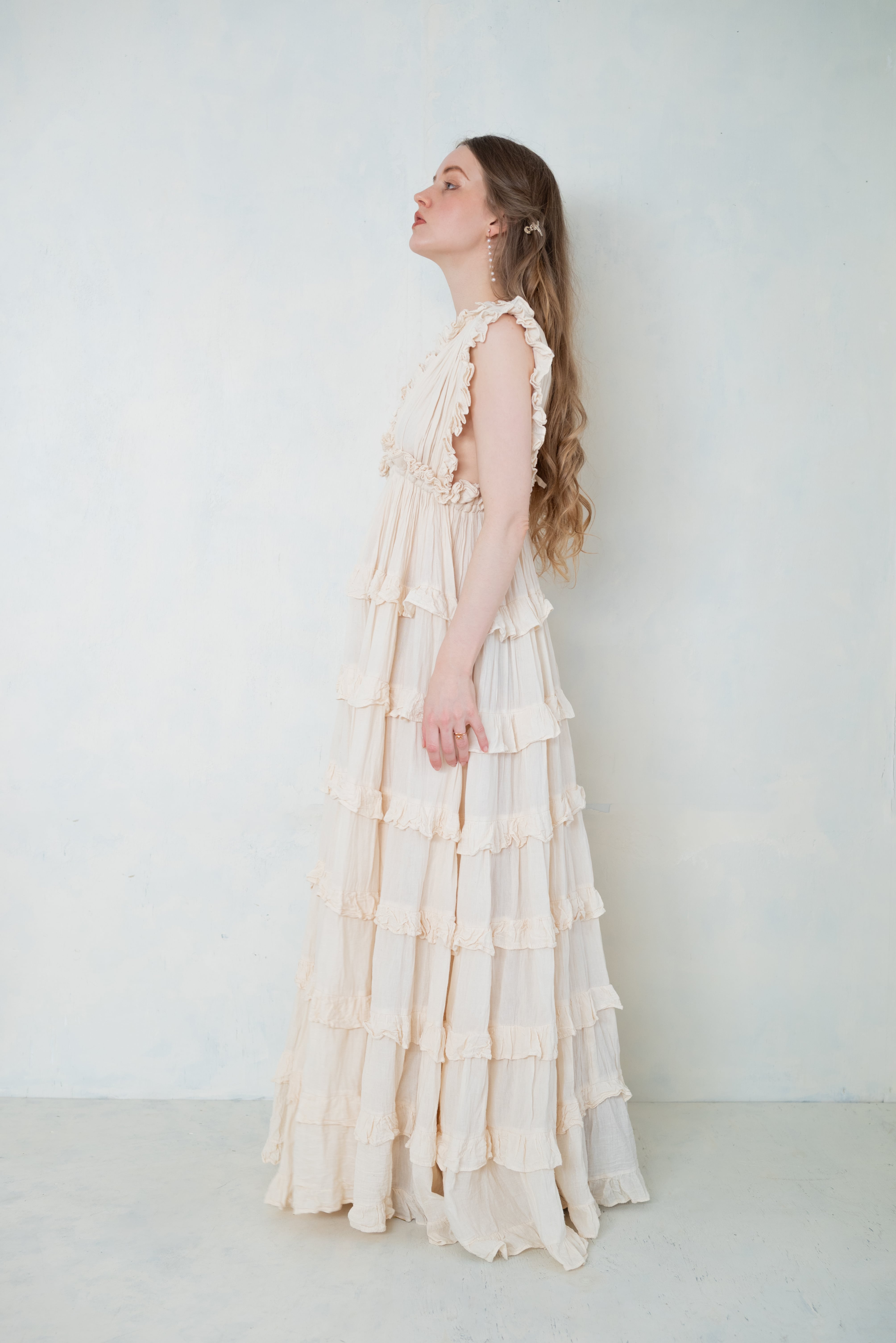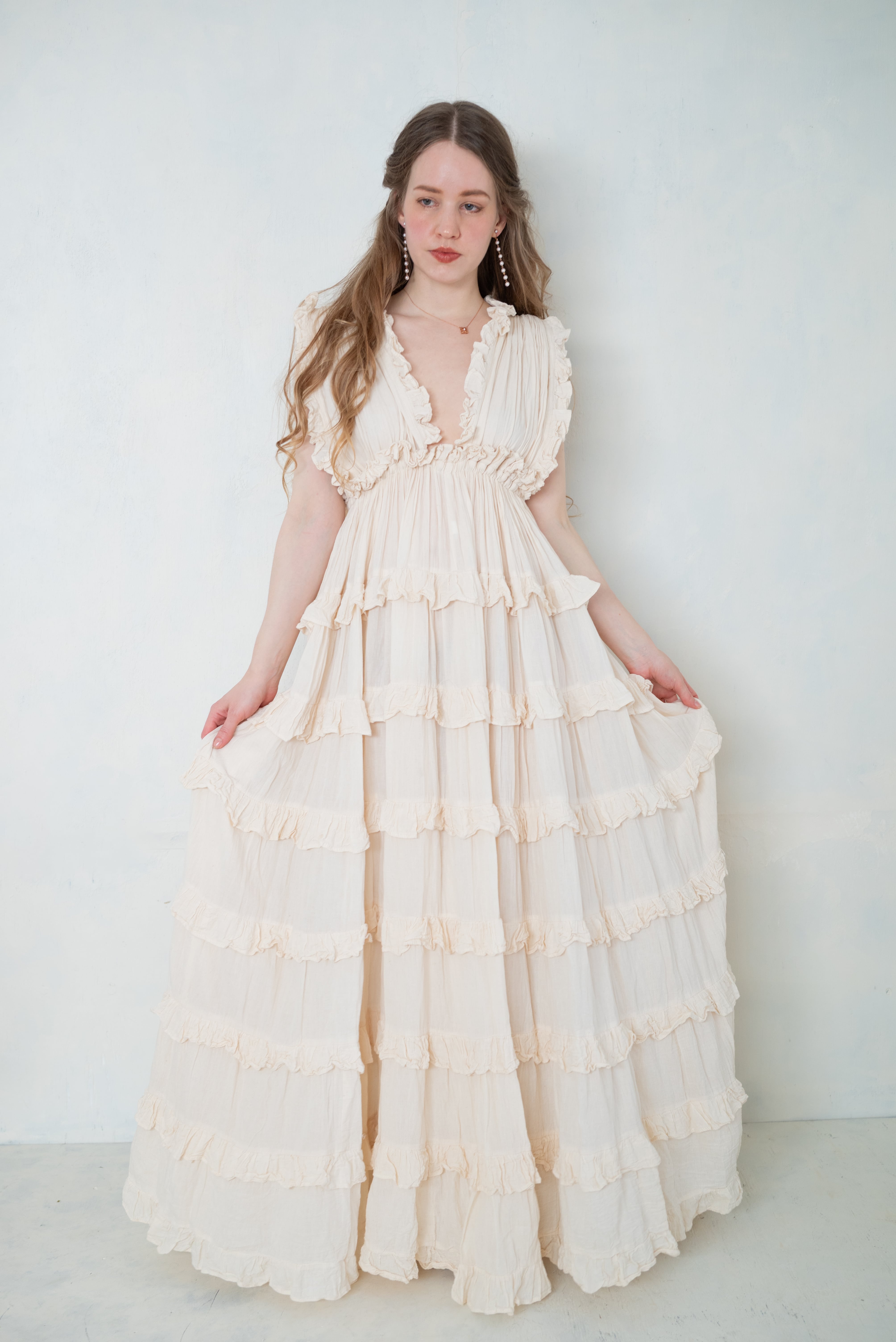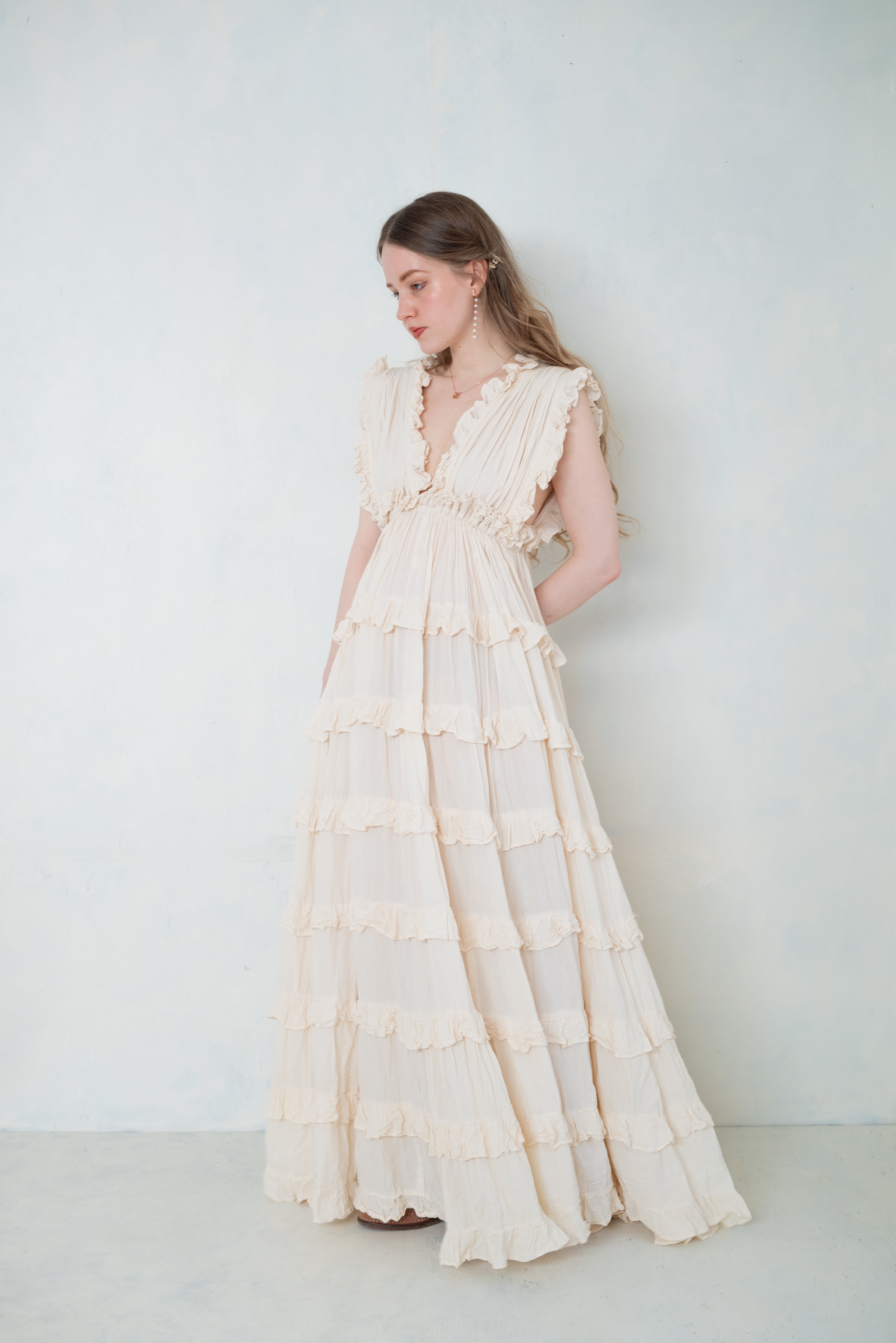 柔らかな生成りカラーと、繊細なフリルが印象的なロングドレス。