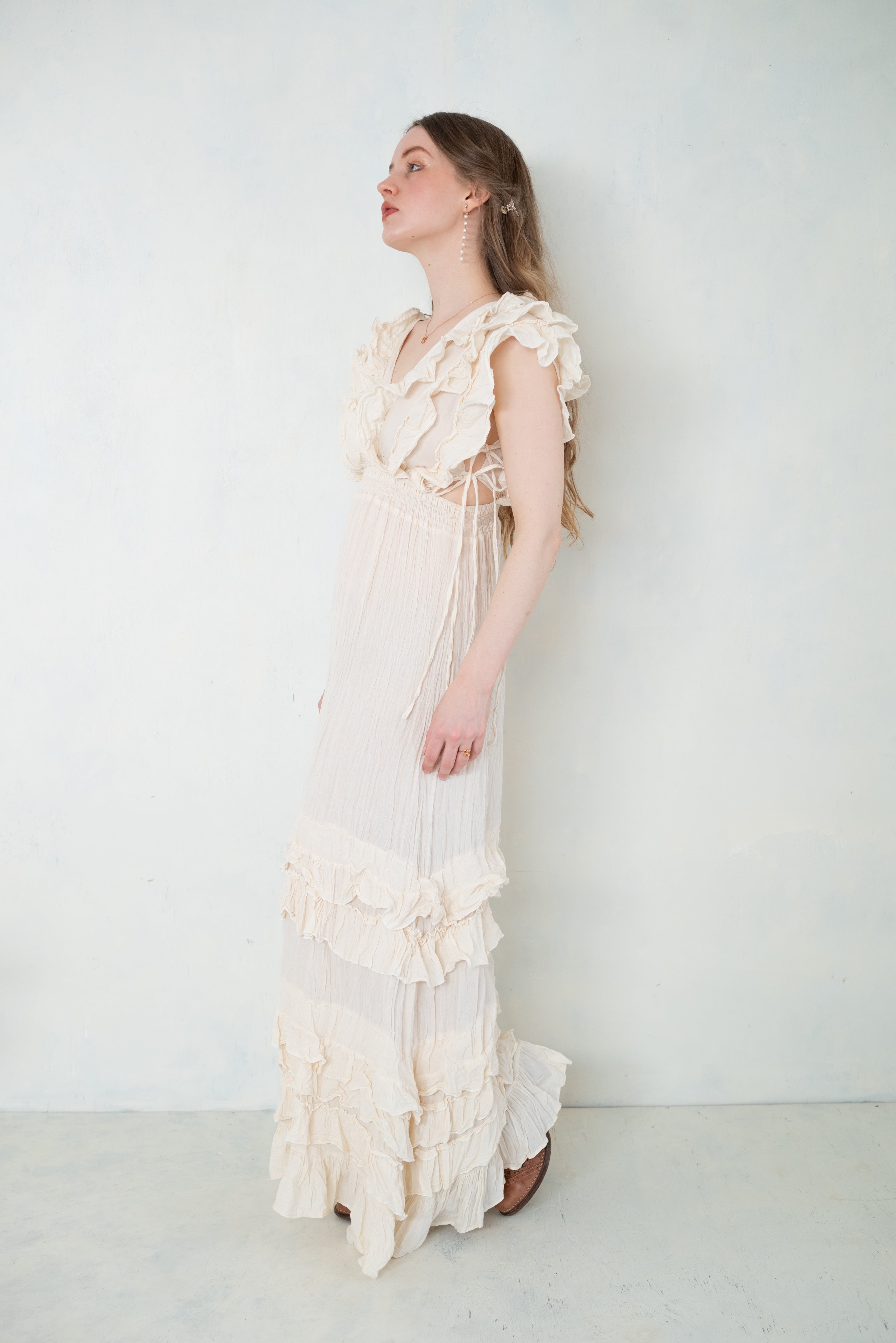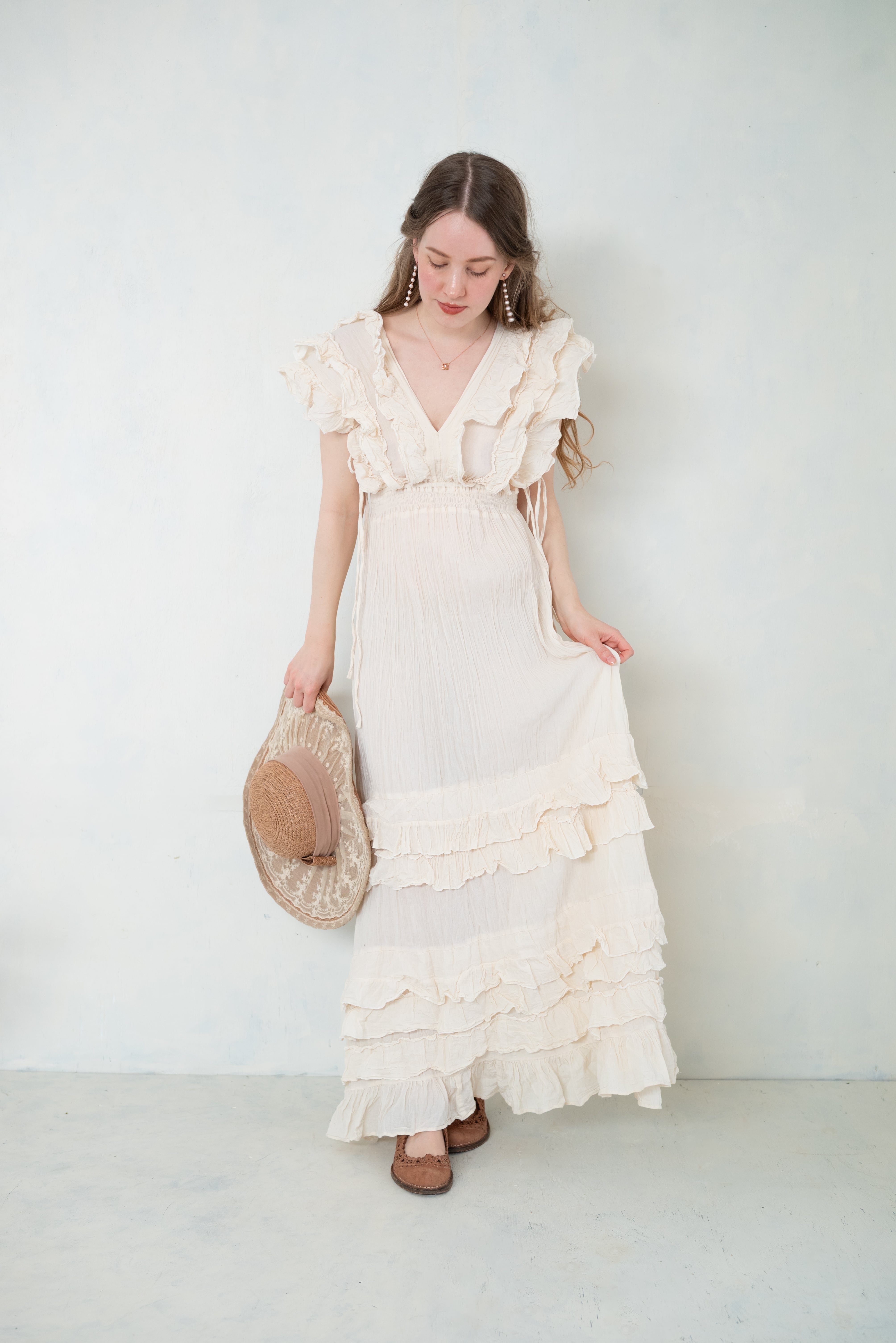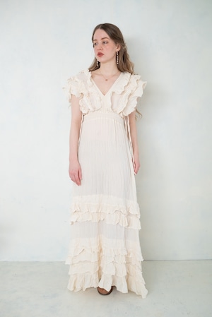 やわらかな光をまとったような、軽やかなフリルドレス。