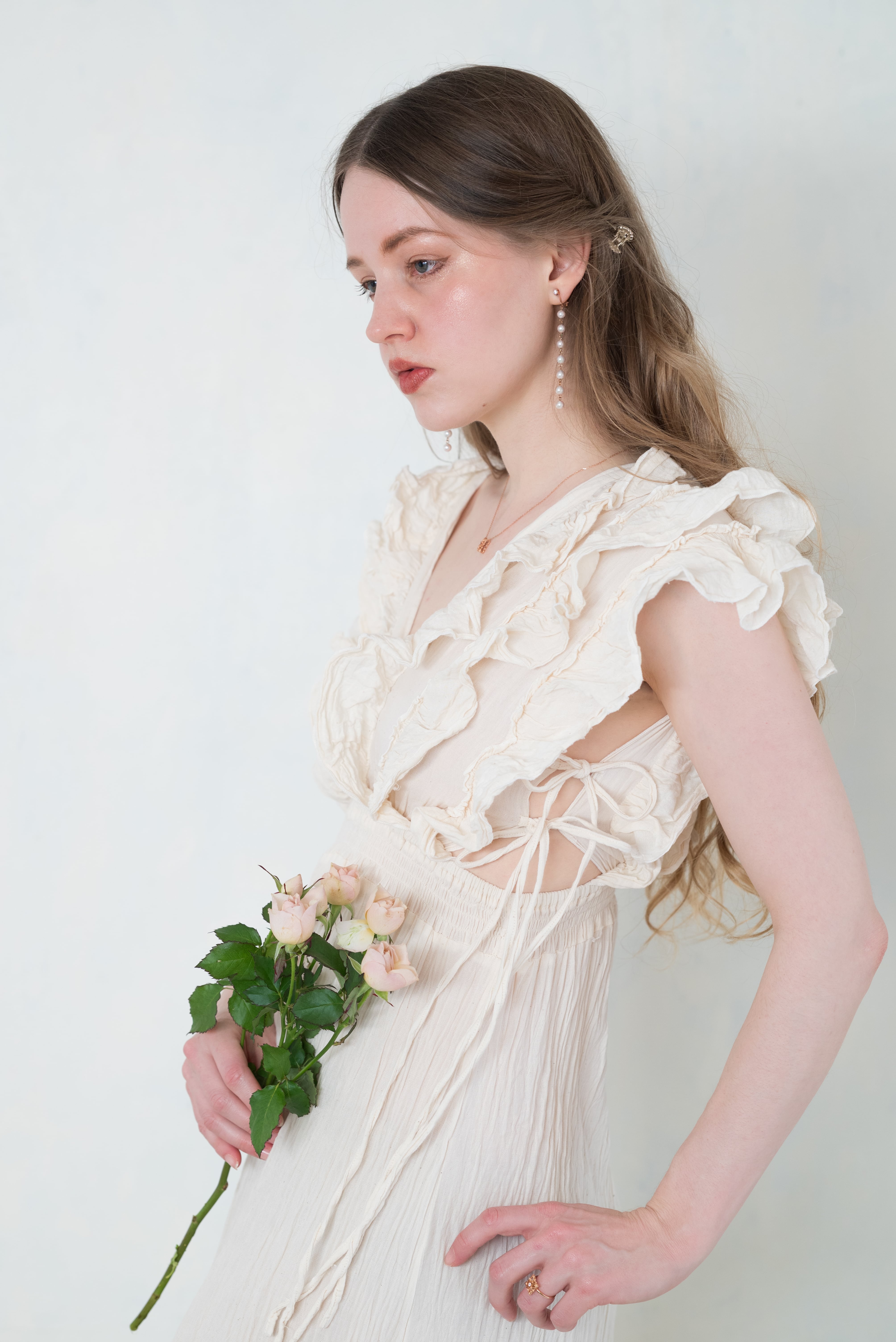 胸元にあしらわれた繊細なフリルとリボンが、
