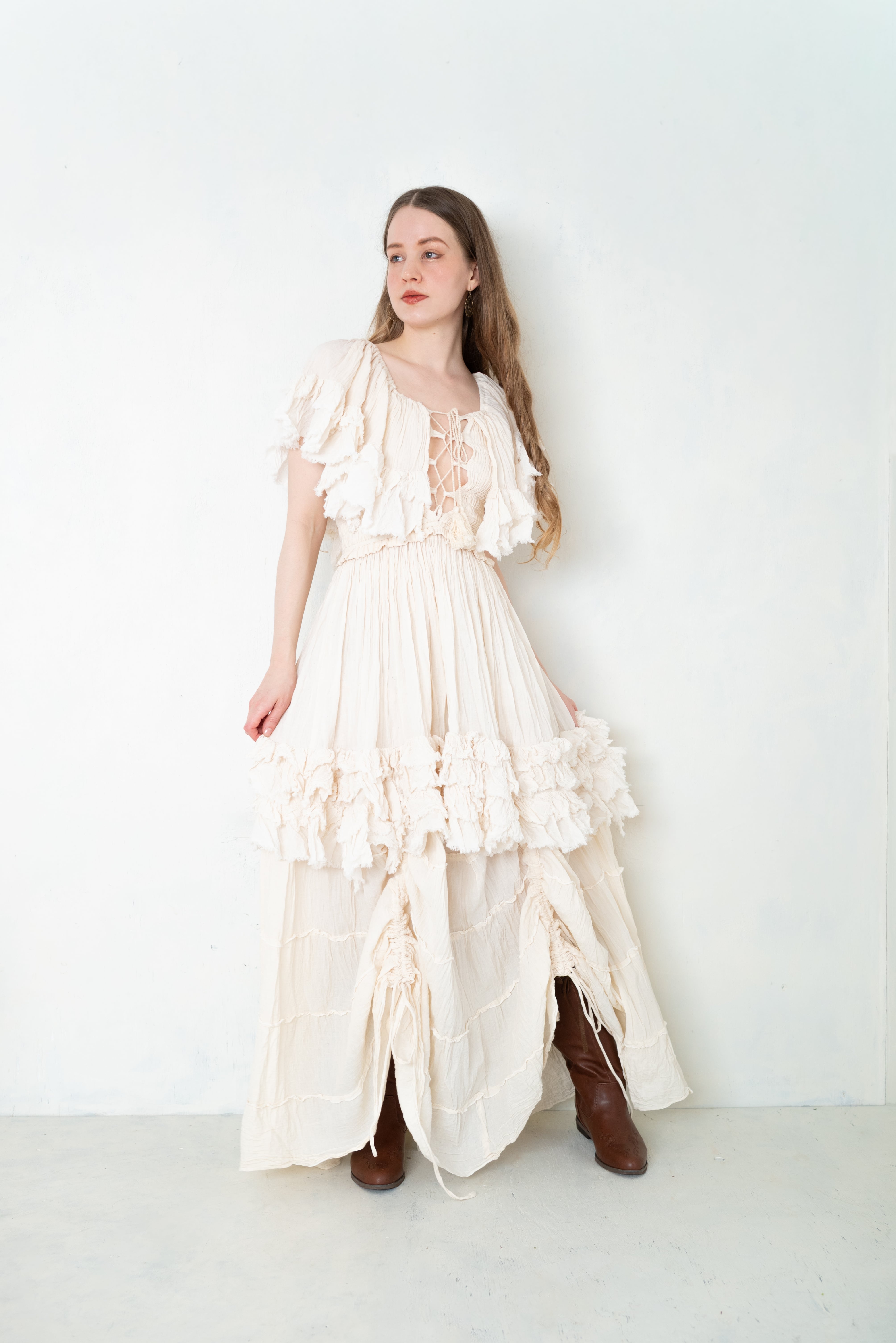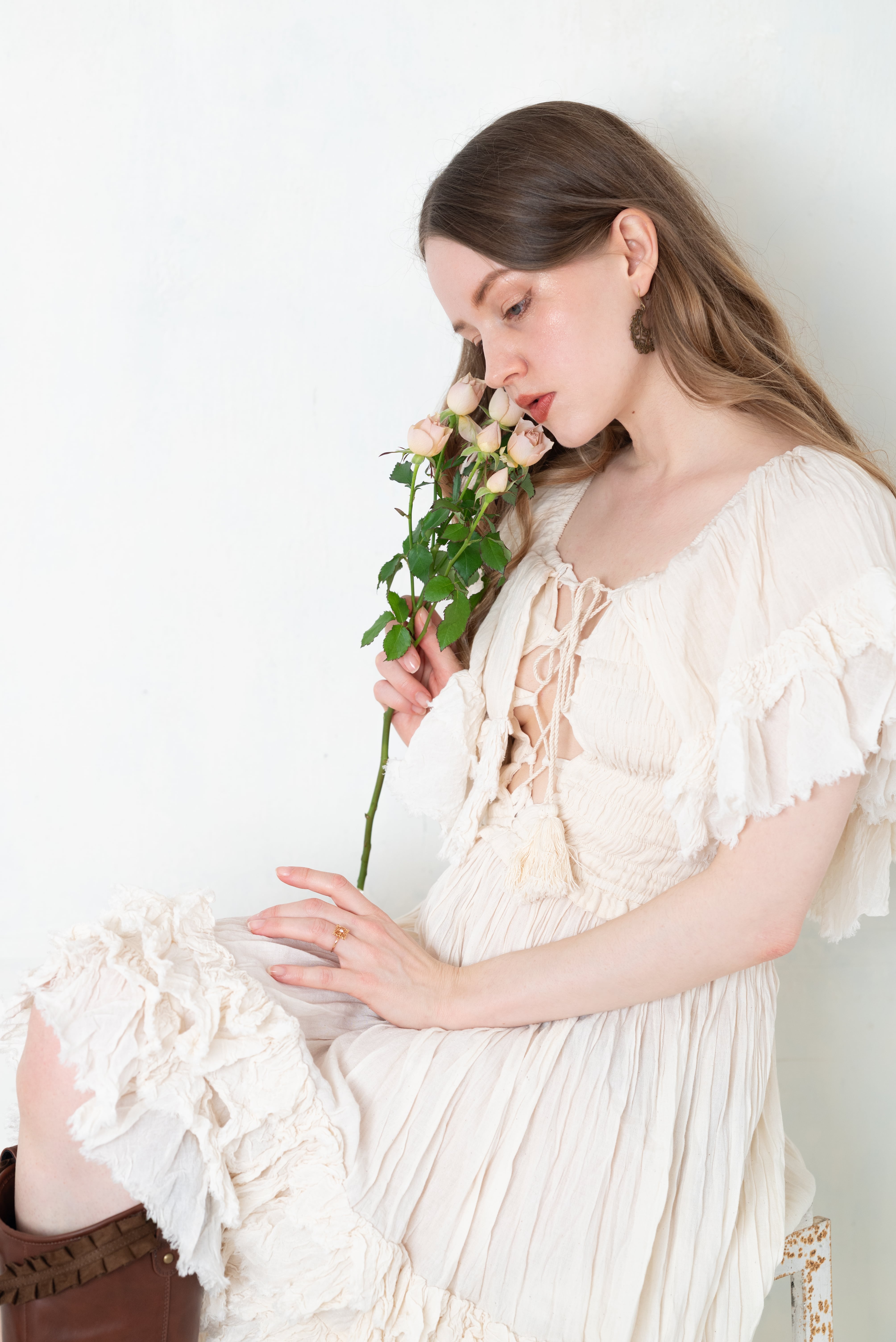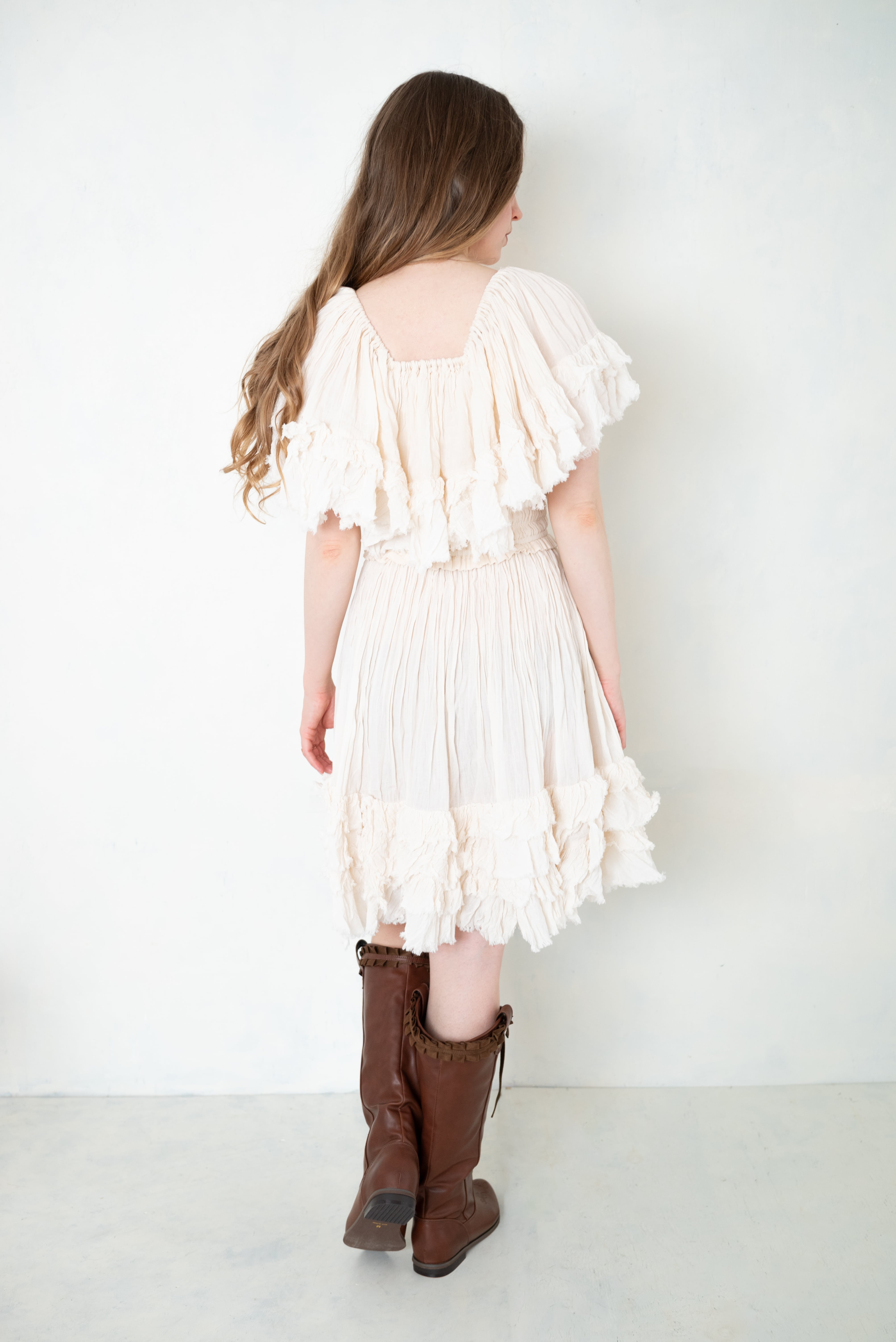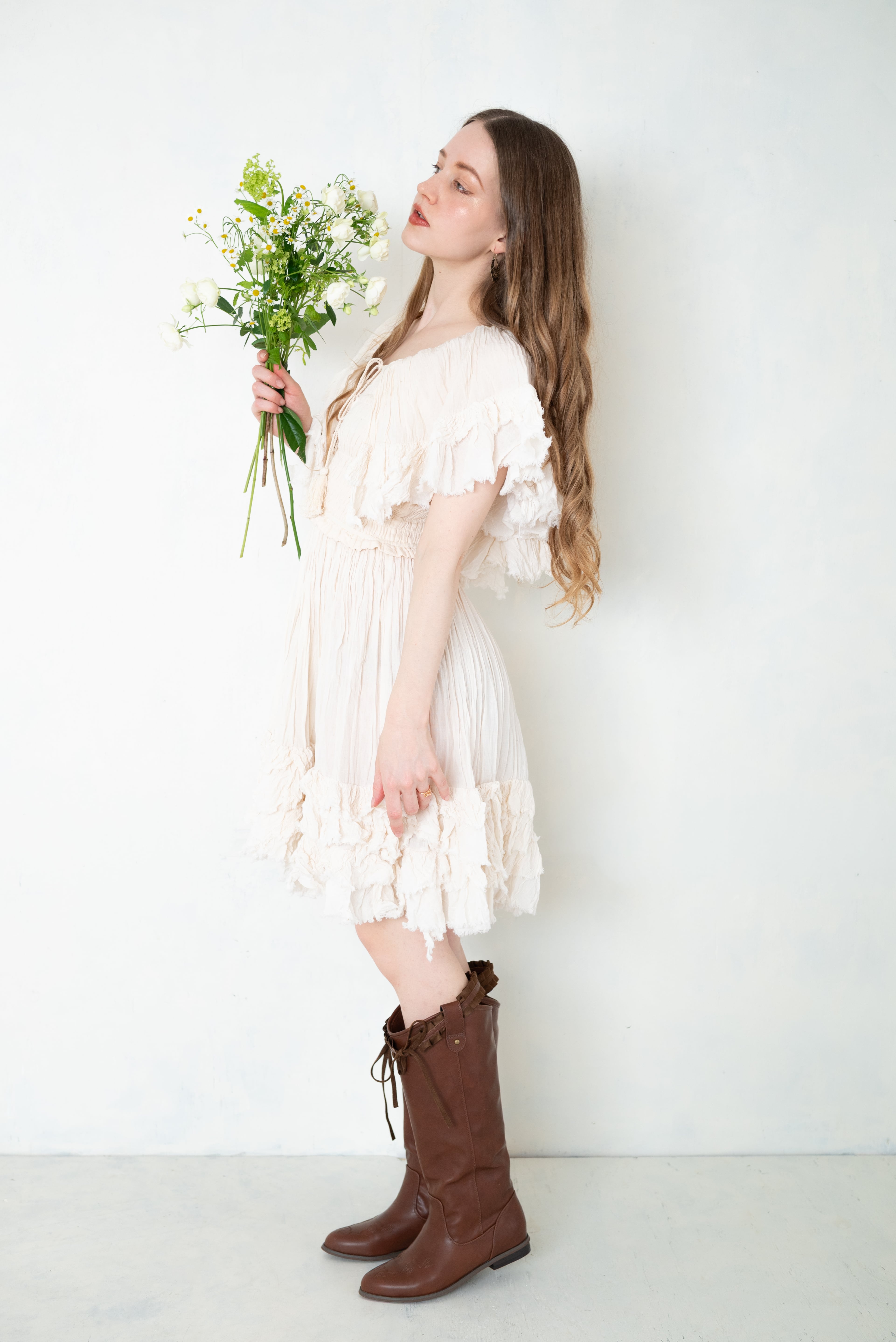 花びらのようにやわらかく広がるフリルが印象的なドレス。