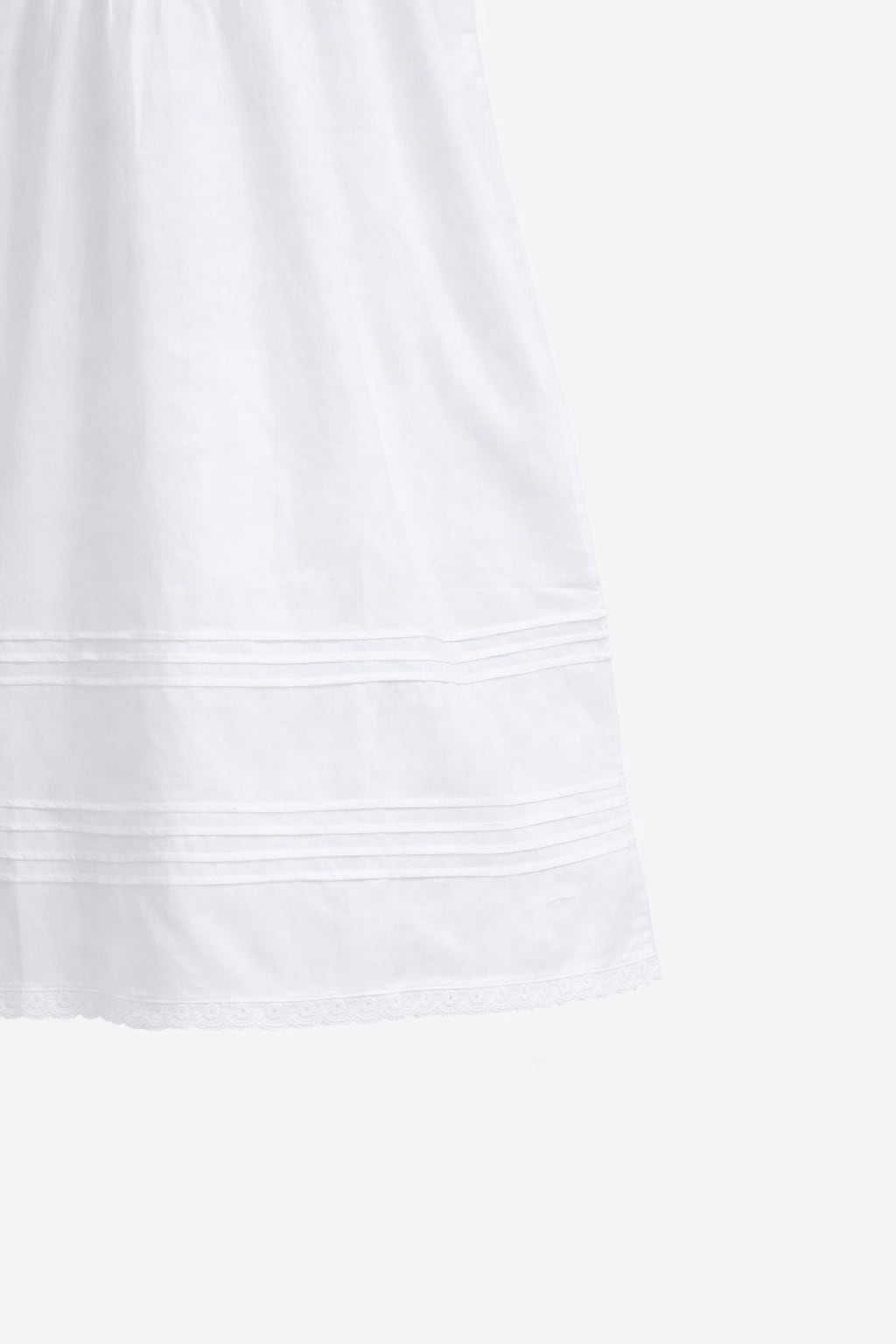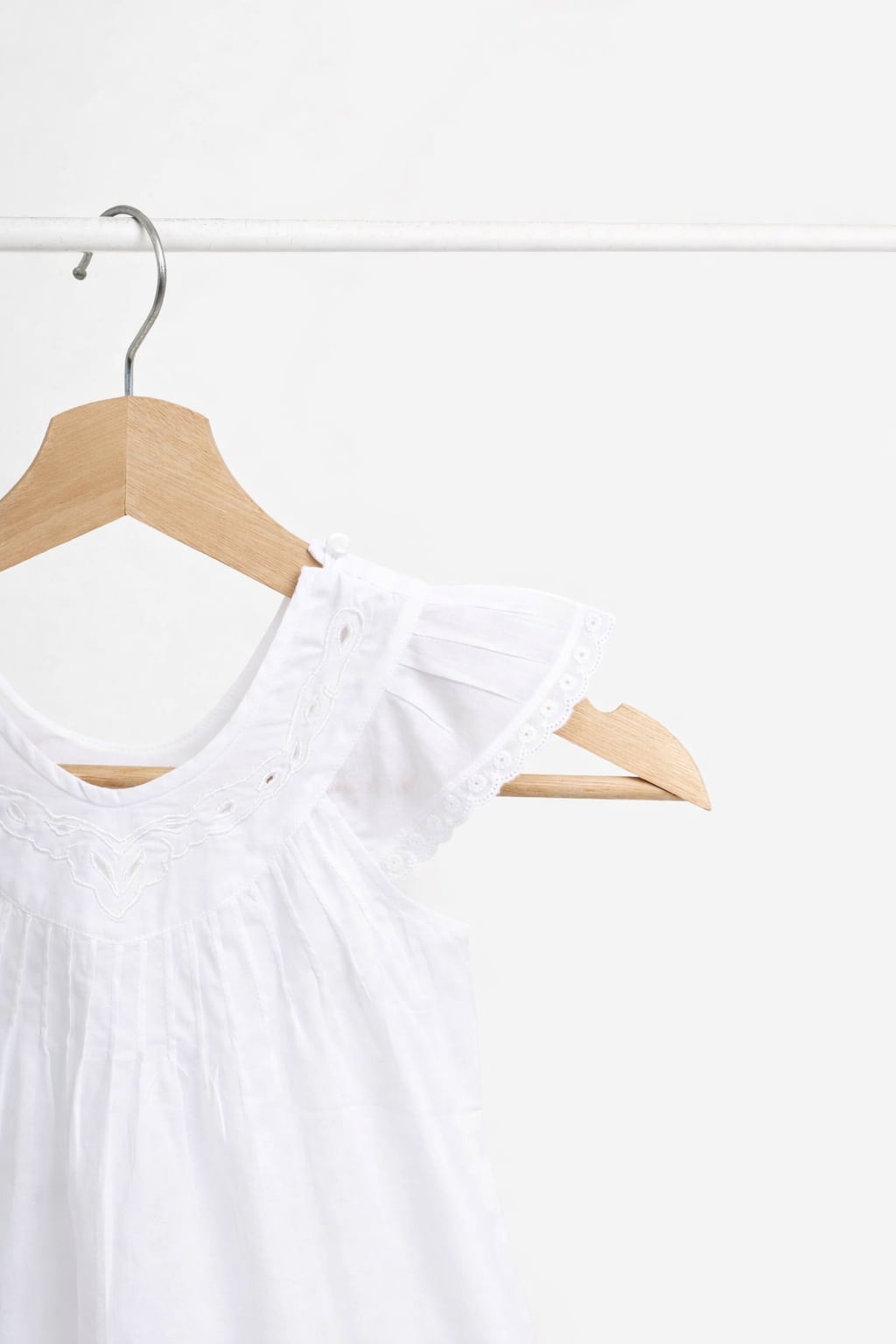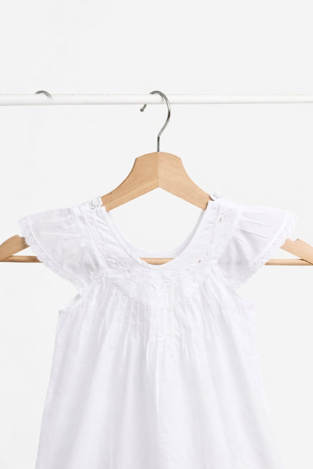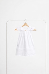 ふんわりとしたAラインのシルエットは、赤ちゃんの自由な動きを妨げず、それでいて繊細で儚げな美しさを引き立てます。襟元に施された手刺繍のレースやスカラップの縁取りは、職人が一針ずつ心を込めた証です。